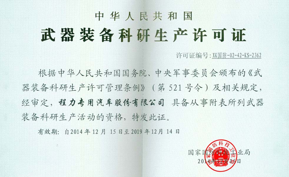 幾乎通過了專用車類所有國內(nèi)國際認證,具有客車生產(chǎn)資質(zhì)、特種車生產(chǎn)許可資質(zhì)和國家武器裝備科研生產(chǎn)資質(zhì),840多個“程力威”牌產(chǎn)品列入國家公告目錄。