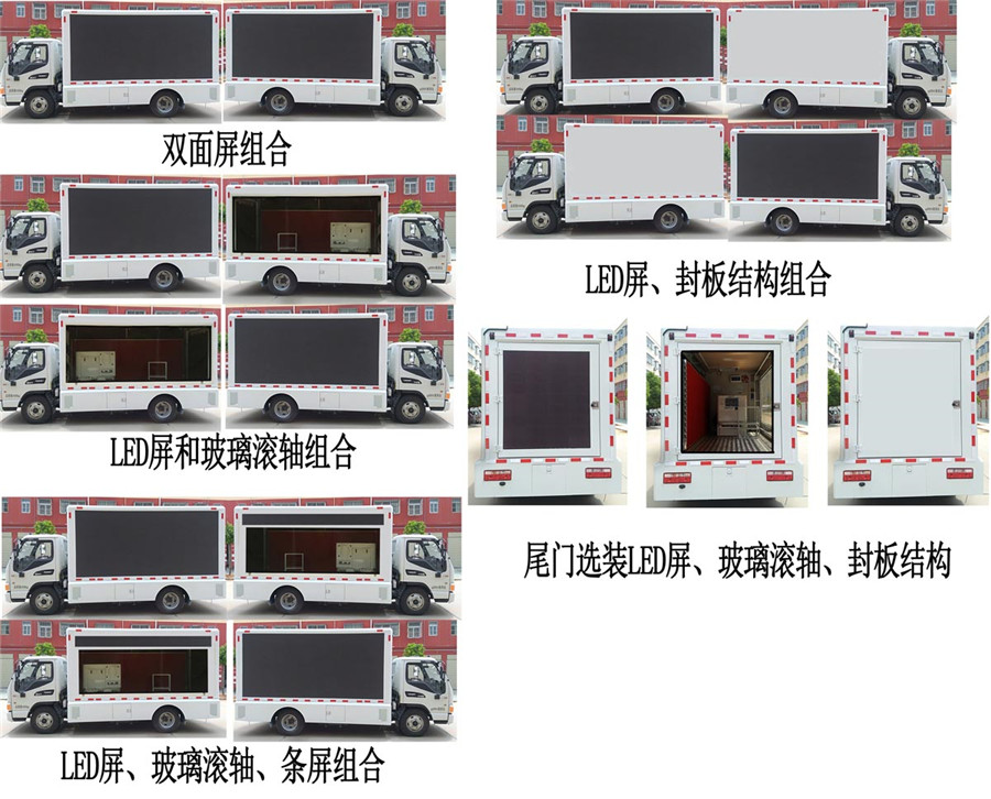 | 配置 | 該車是用于廣告宣傳的專用車輛.專用裝置為LED顯示屏.側后防護采用裙板結構代替,后部裙板離地高為450mm.ABS型號/廠家為VIE ABS-Ⅱ/浙江萬安科技股份有限公司;兩側,尾門均可選裝LED屏,滾軸玻璃,條屏,封板(至少一側有LED屏)等結構.隨底盤選裝駕駛室. | ||