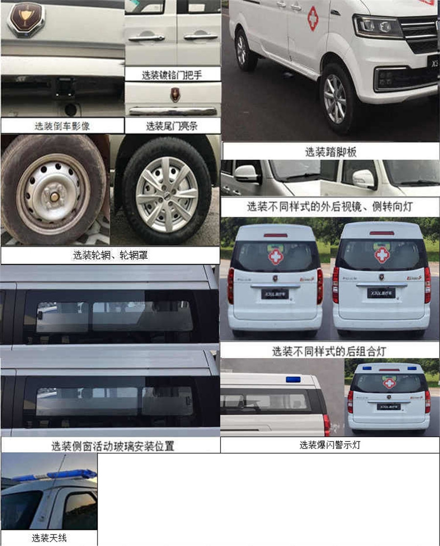 | 配置 | 該車配備醫療器械柜,擔架,特種車輛標志燈及警報器等救護專用裝置.選裝(輪輞、輪轂罩、鍍鉻門把手、尾門亮條、倒車雷達、倒車影像、踏腳板、側窗活動玻璃安裝位置、不同樣式的后組合燈、不同樣式的外后視鏡及側轉向燈、天線、EPS、爆閃警示燈).ABS型號/生產單位:APG3550500G/浙江亞太機電股份有限公司。SWD16M發動機最大凈功率80kW. | ||