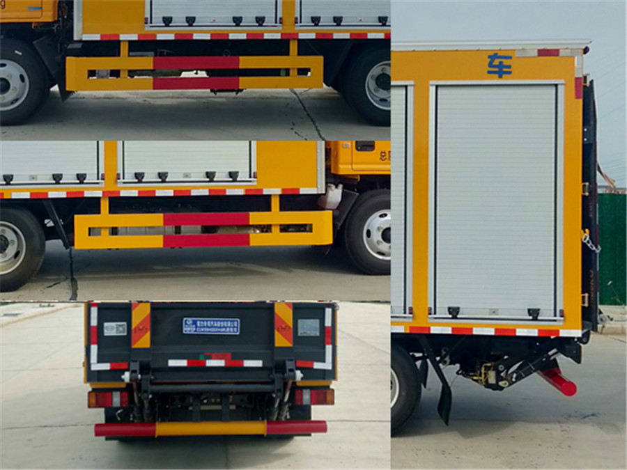 | 1、廂體內(nèi)設(shè)有專用裝置:直流高壓發(fā)生器、斷路器導(dǎo)電回路電阻測試器、電纜故障探測儀等,主要用于應(yīng)急搶險(xiǎn)救援,頂部封閉不可開啟;2、側(cè)/后防護(hù)材料為Q235A,側(cè)防護(hù)螺栓連接,后防護(hù)焊接連接,后防護(hù)截面尺寸120?20mm,下邊緣離地高360mm;3、ABS型號/廠家: APG3550500A/浙江亞太機(jī)電股份有限公司;4、該車裝有液壓尾板,液壓尾板收起狀態(tài)的水平長度為280mm,尾板質(zhì)量為350kg;5、各發(fā)動機(jī)凈功率(kW)值如下: JX4D30B6H/83, JX4D30A6H/93. | |||