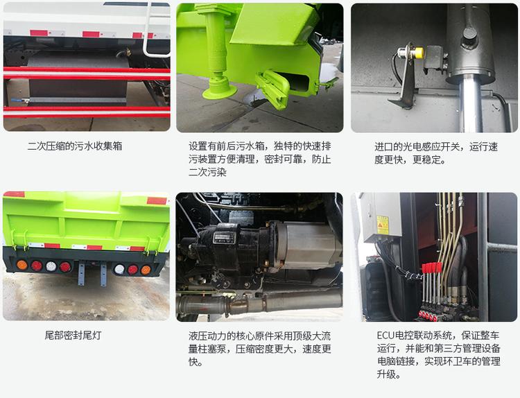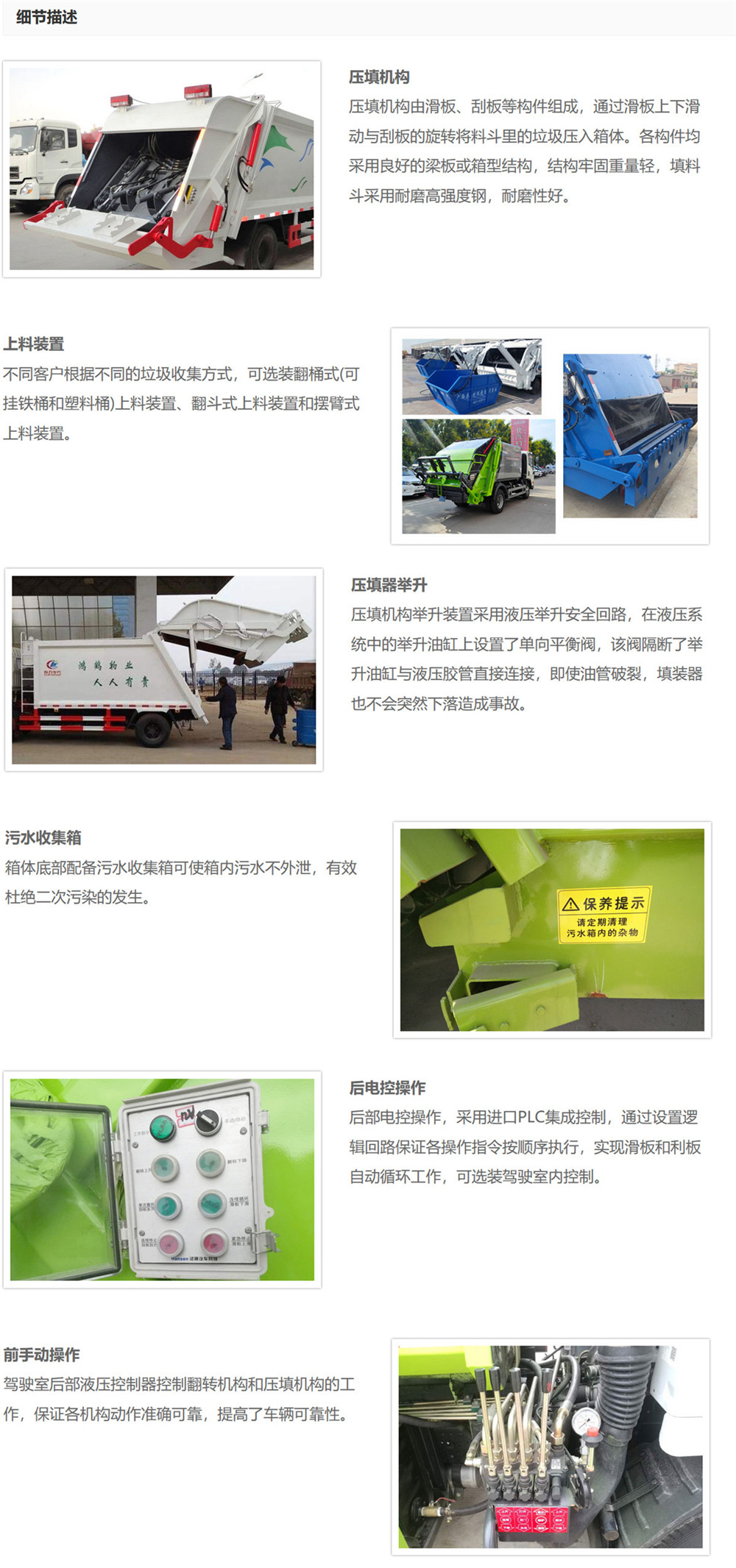 1. 壓縮垃圾車又稱為后裝式壓縮垃圾車,是收集、中轉清運垃圾,避免二次污染的新型環衛車輛。利用后裝填充器與垃圾桶或垃圾斗對接,一起組合成流動垃圾中轉站,實現一車多斗垃圾無污染循環收集清運。有效地防止了收集、運輸過程的撒落、飛揚造成的二次污染。